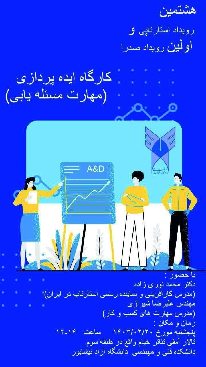 در حاشیه برگزاری هشتمین رویداد استارتاپ ویکند نیشابور با مشارکت مرکز رشد فناوری نیشابور و دانشگاه آزاد اسلامی نیشابور، کارگاره ایده پردازی و مهارتهای مساله یابی توسط کارشناس مرکز رشد فناوری نیشابور برگزار گردید.