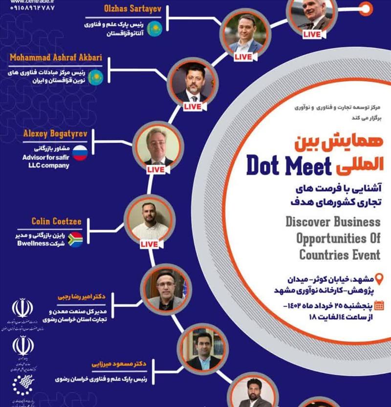 همایش بین‌المللی آشنایی با فرصت‌های اقتصادی و تجاری کشورهای ایتالیا، قزاقستان، روسیه و آفریقای جنوبی با عنوان «Dot Meet» به منظور تبادل تجربیات و گسترش تعاملات مشترک توسط مرکز توسعه تجارت فناوری و نوآوری با همکاری پارک علم و فناوری خراسان عصر روز پنجشنبه در مشهد برگزار شد.